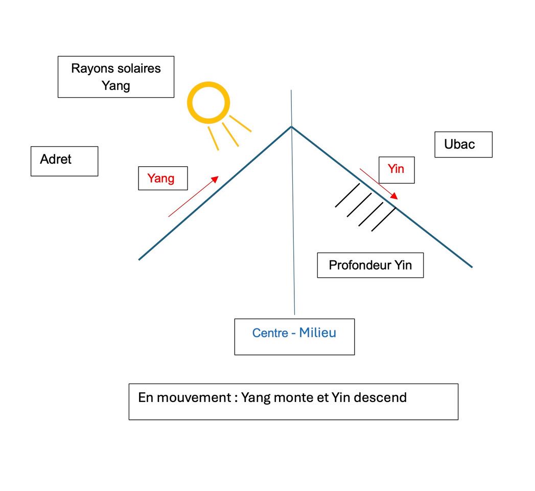 Ce principe Yin-Yang est souvent vu comme deux termes opposés, en fait ils sont complémentaires et même d’une unité. Au cours de 24h la lumière du soleil croît puis elle décroît. Ainsi un cycle se manifeste par le mouvement de la terre autour du soleil. Le temps diurne et le temps nocturne sont aussi essentiels. D’autres rythmes sont compréhensibles : la respiration est une succession de temps d’expiration suivi de temps d’inspiration suivi elle-même de temps d’expiration puis d’inspiration… Il est impossible d’expirer ou d’inspirer uniquement. Une respiration contient les deux mouvements d’inspiration et d’expiration. Ce tout correspond à deux phases complémentaires.